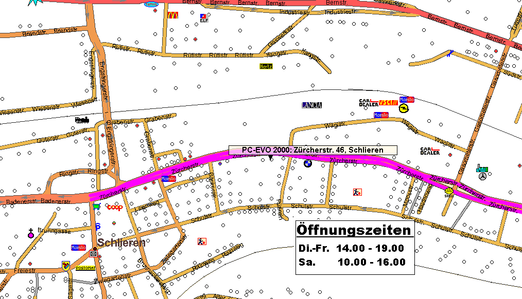 PC-EVO-2000 Zürcherstrasse 46 8952 Schlieren Tel. +41 44 730 96 01 Nat. +41 76 465 99 45 E-Mail: info@pc-evo-2000.ch Von dem Lilienzentrum aus: Nach dem Lilienzentrum (Direktion Zürich) alles geradeaus ca. 300m Bei der nächsten Bushaltestelle die man sieht, nach rechts schauen und dort ist das Geschäft: